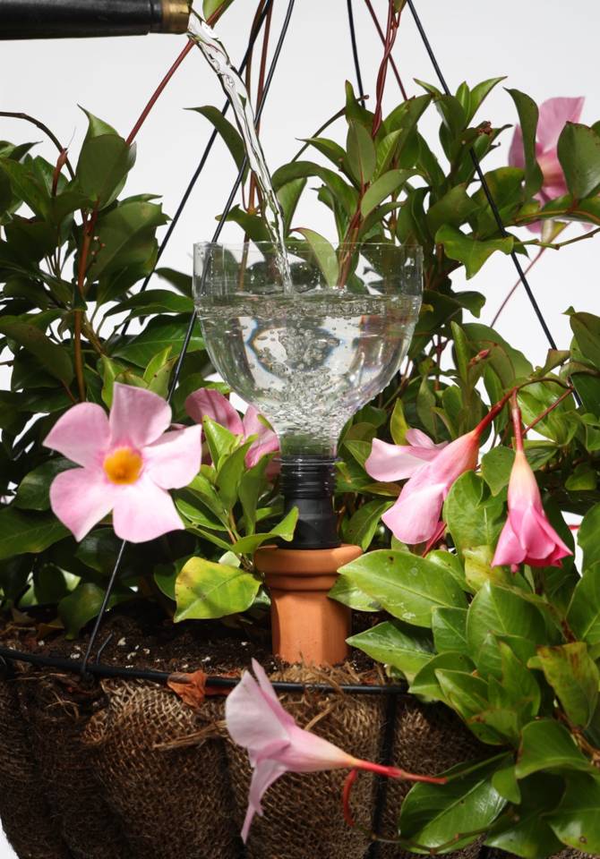 Easy-Fill stakes are designed to work with open-topped reservoirs. This is very helpful when watering a deck full of plants. They are excellent for hanging planters which need regular watering to flourish. Note that plastic bottles can be cut to fit well in hanging planters as shown in the photo. Easy-Fill stakes all come with an instruction booklet that gives simple and safe bottle cutting steps.